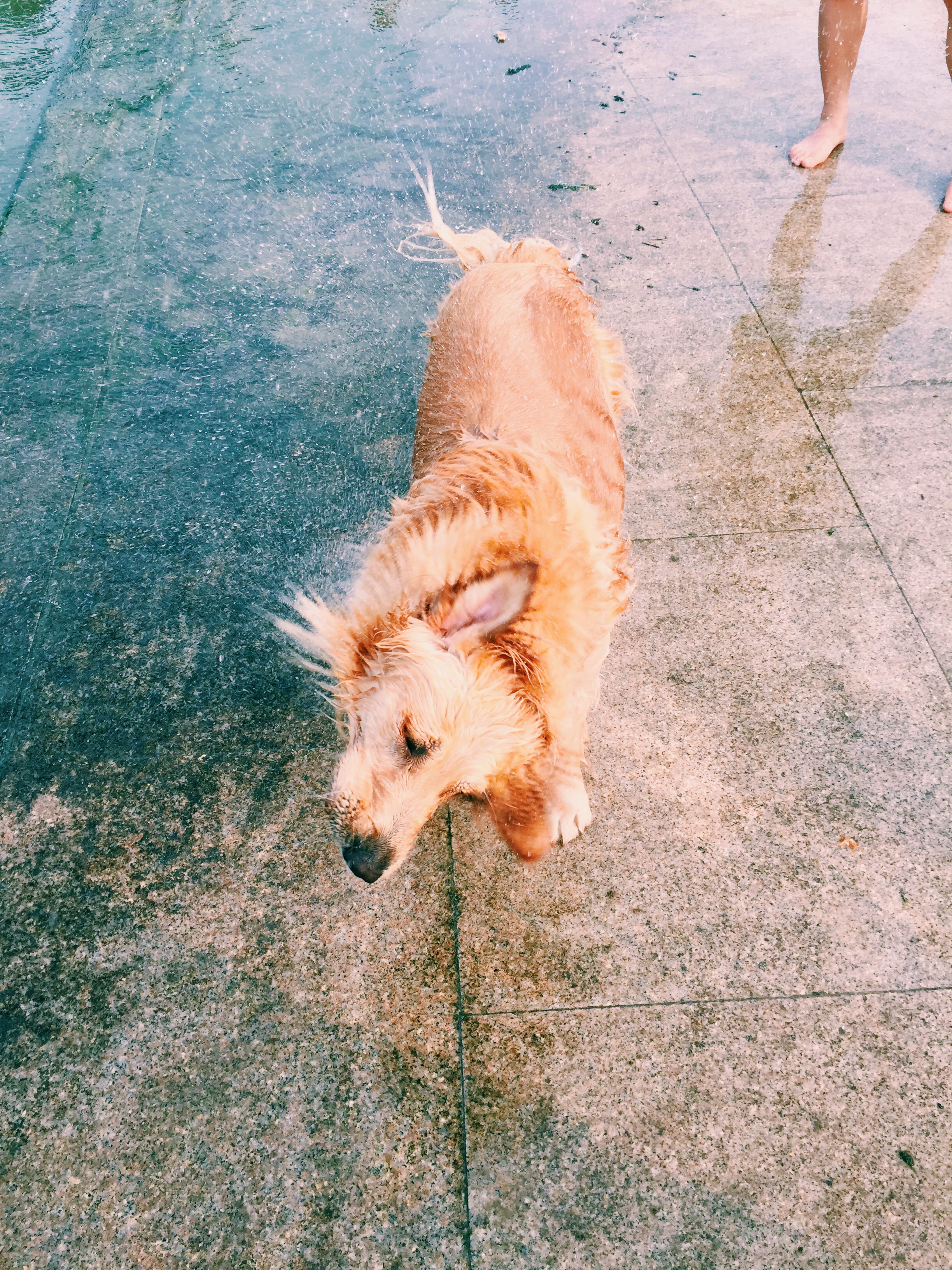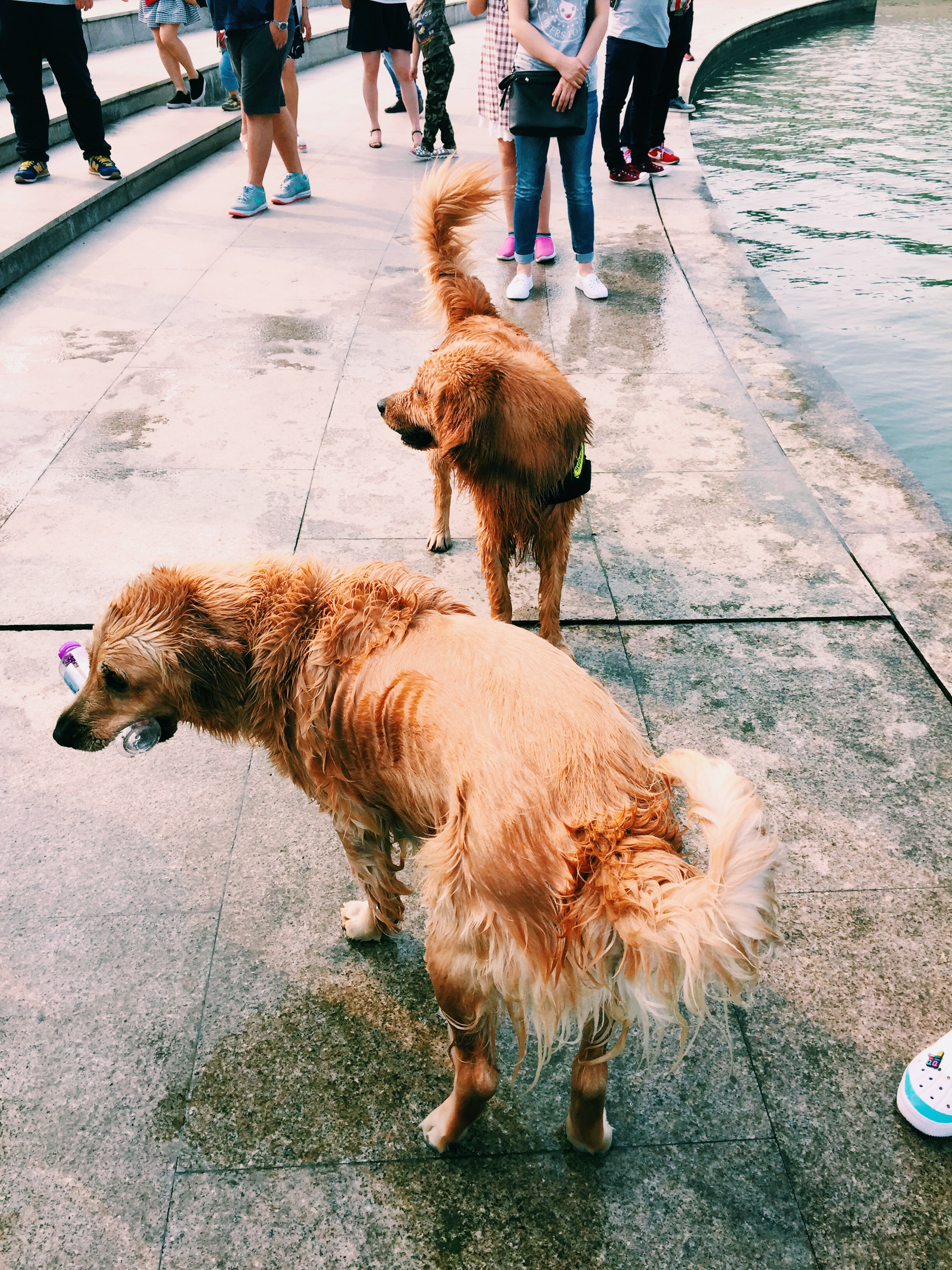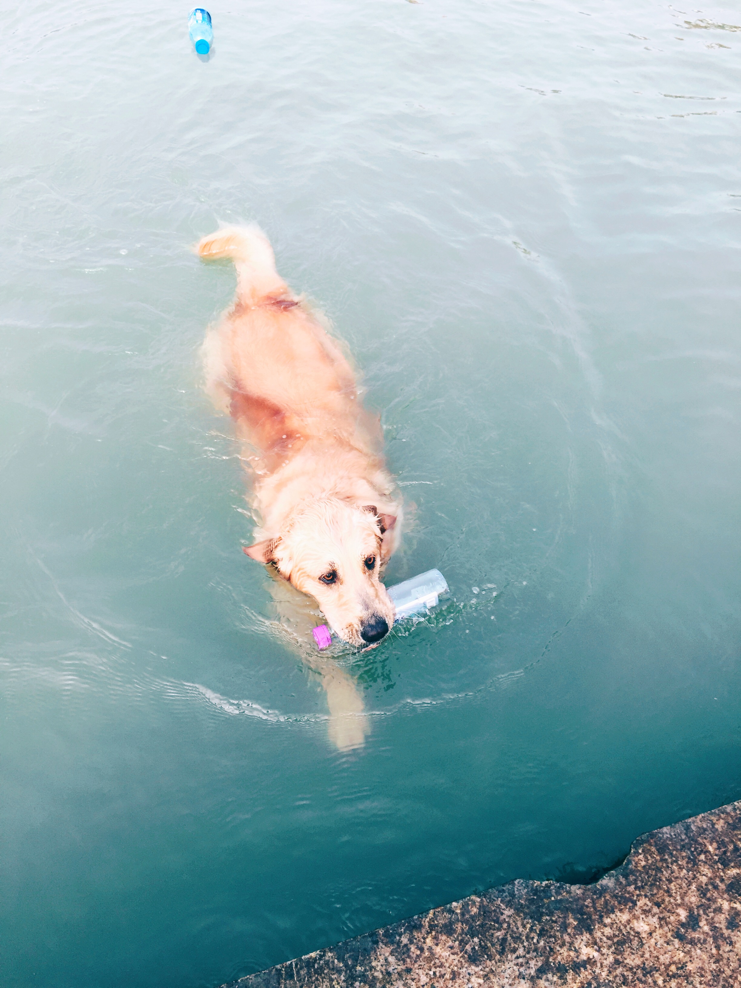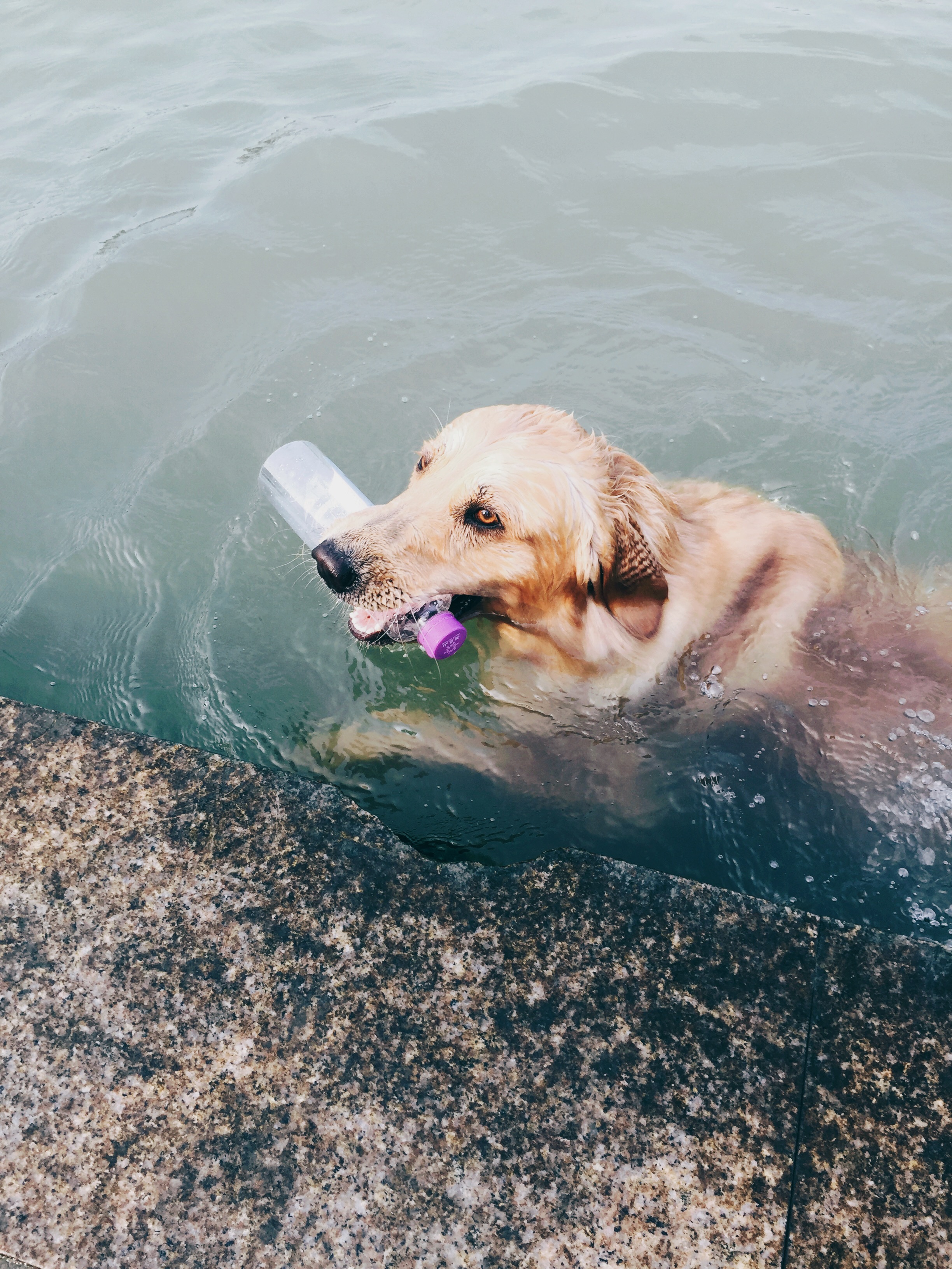 总是跃跃欲试,不敢迈出那一步,最终被小帅残忍的扔进了水里。带着无限的恐惧,很快扑腾到了岸边,看着他那渴望被救上来的眼神,我又是想笑又是心疼他。最终只能把它带到岸边有平台支撑的水面进行玩耍,相信多有几次训练他会变得勇敢,就会像下图中的依依一样,勇敢的跳进水中,开心的游来游去。