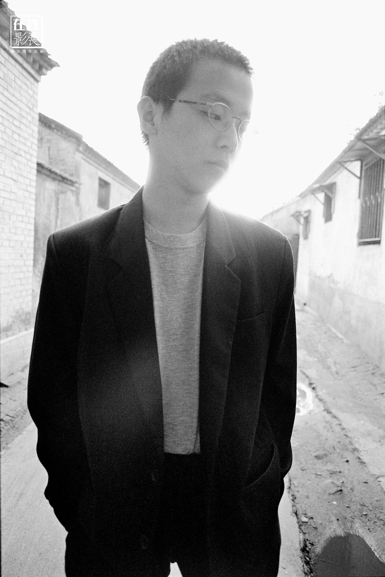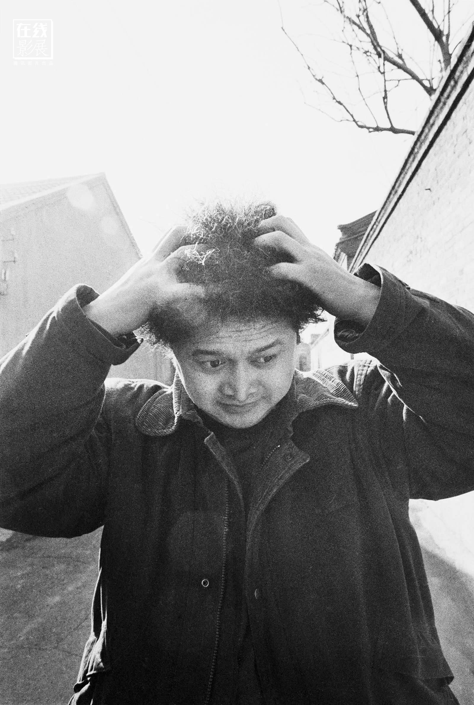 图为电影导演张元,北京,1993年2月。“张元一头钢丝头发,我刚到的时候,他刚起床,睡眼惺忪,时差肯定还没倒过来,他也没洗脸,直接就拿着资料去办事。这张相片拍于他家和吕楠家的一条安静的小胡同。工作时间为两分四十几秒,用去29格底片。”