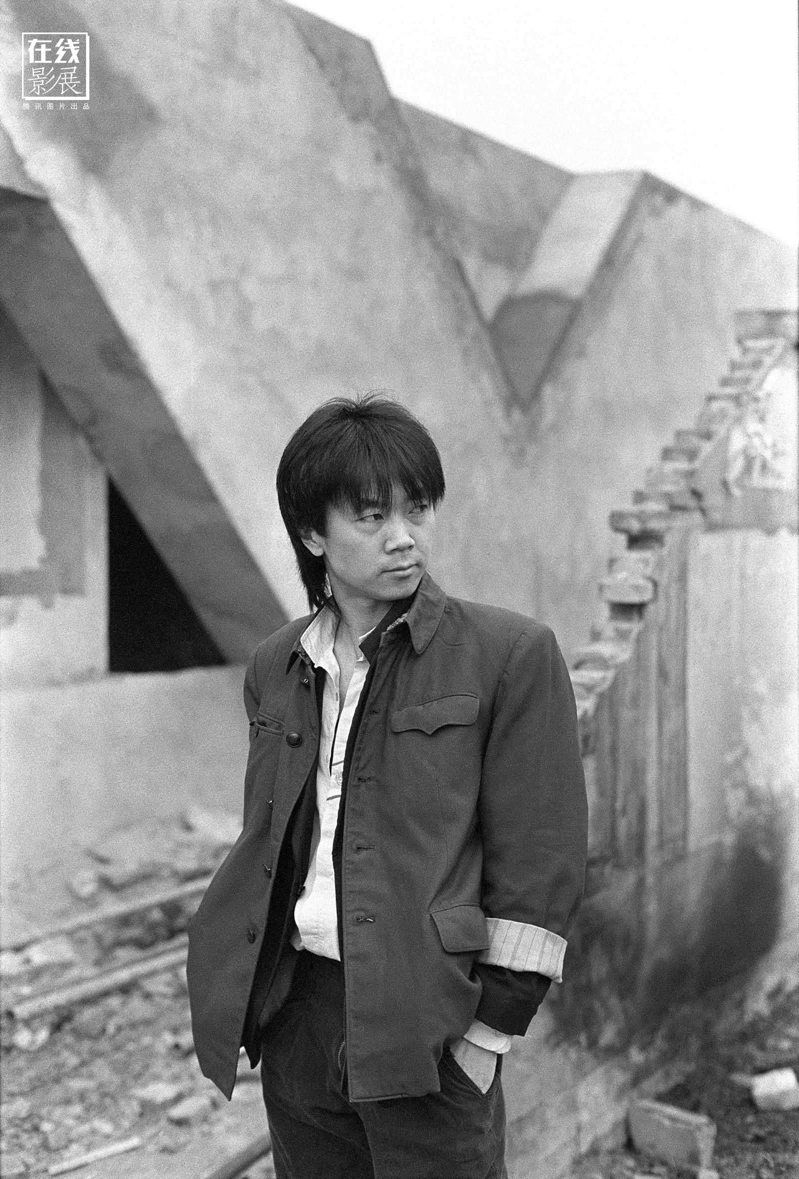 图 为摇滚艺术家崔健,成都,1990年3月。“我和崔健、王晓京去电视台取录像带,在电视台门口,我见有一堆旧墙和TV的V字正好奇妙地组合在一起,便请老 崔下车拍照。崔健想了想,下了车。我操起相机,按了21张,老崔不停地改变着身体姿势。一分钟后,我心里有数一幅好照片已经诞生了。”