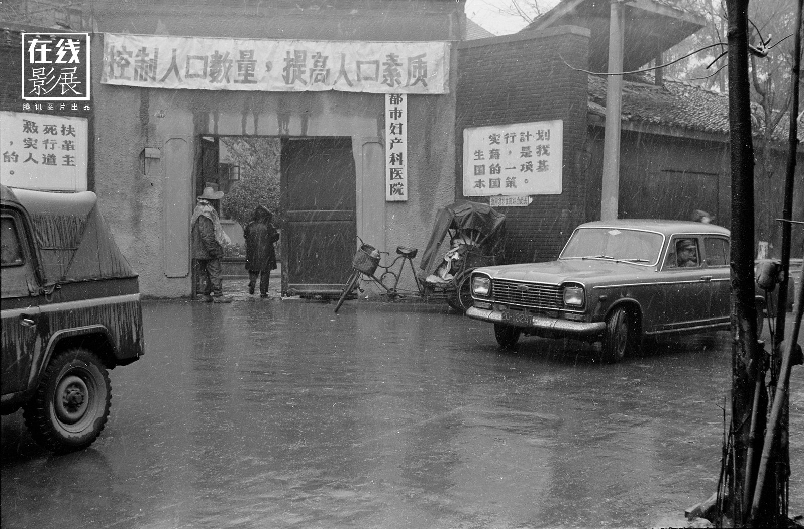 1983 年的冬天,肖全来到了包家巷的成都妇产科医院。那天,下雪了,雪花砸在来往的车上。有自行车、三轮车、吉普车、小轿车,它们停在门口。门口贴着一条褪色的 横幅:“控制人口数量,提高人口质”——“量”字不见了。横幅下,有人进去,也有人出来。看着他们,肖全按下了快门,他觉得眼前的景象有一种别的含义: “人们在医院门口进进出出,有的挺着肚子,有的用毛毯包着小孩。我当时就想,人类还不是跟这漫天的雪花一样,飘落在地球的吗?”此时的中国,计划生育政策 实施了两年……肖全知道,他记录下的,不是寻常的街景,不是漂亮的风光,而是历史。图为包家巷成都妇产科医院,成都,1983年。