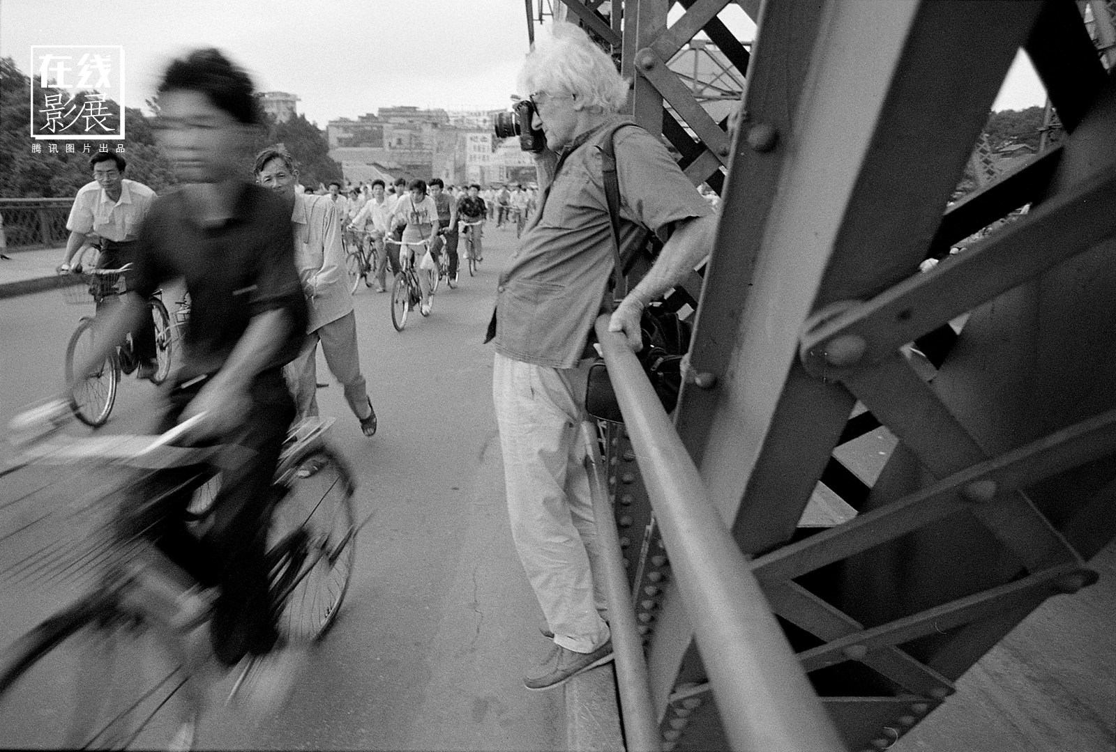 1993 年,肖全和马克·吕布见面,并担任他的摄影助理。“我很幸运跟他结缘,马克·吕布对我很好。他有一次很认真地对我讲,你要我怎么帮你?我说你已经帮到我 了。在他80岁生日的时候我送给了他一个礼物,那个礼物是他在中国我拍了他的工作照。后来我在明信片上写下:献给一个80岁还在拍照片的人。我亲身感受到 了摄影师是如何面对他的工作和生活的,马克·吕布只能让人敬仰却难以效仿。”图为马克·吕布在广州,1993年。